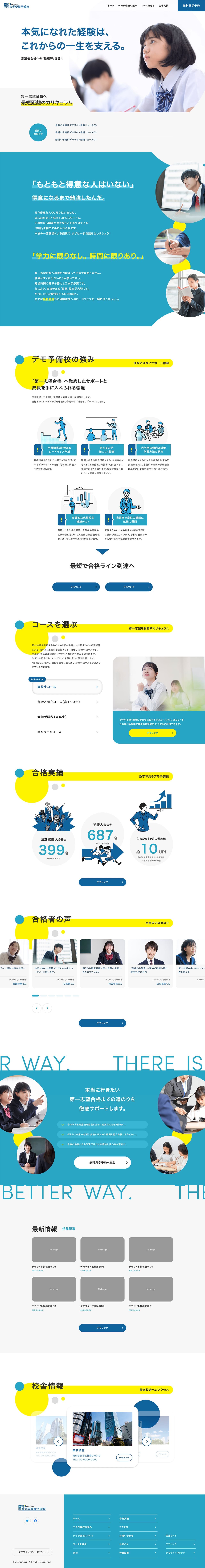 メインターゲットは「学習意欲が高い高校生」を想定(保護者向けの受講料や指導方針の紹介は別ページにある設定)し、予備校らしい知的な色使いと安心と信頼感のあるデザインで、充実したサービス内容を知ってもらいたい順番に説明。